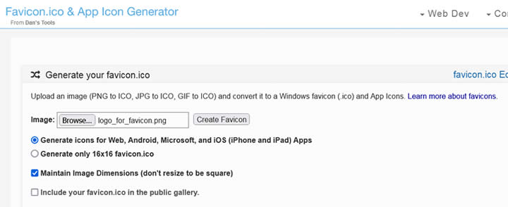 Remember to check the option “Generate icons for Webs, Android, Microsoft and IOS (iPhone & iPad) Apps and “Maintain Image Dimensions (don't resize to be square)”.